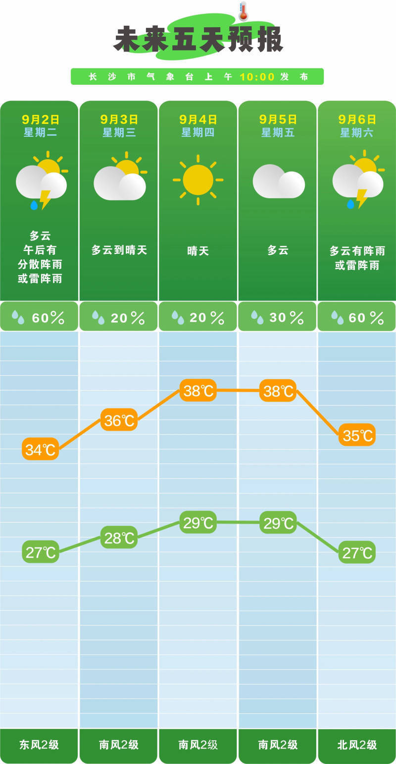 接下来要把这份长沙天气指南收好:9月2日,多云,午后有分散阵雨或雷阵雨,南风2级,27℃至34℃;3日,晴天,南风2级,28℃至36℃;4日,晴天,南风2级,29℃至38℃;5日,晴天间多云,南风2级,29℃至38℃;6日,多云,午后有分散阵雨或雷阵雨,北风2级,27℃至36℃;7日,多云有阵雨或雷阵雨,北风2级,27℃至35℃。